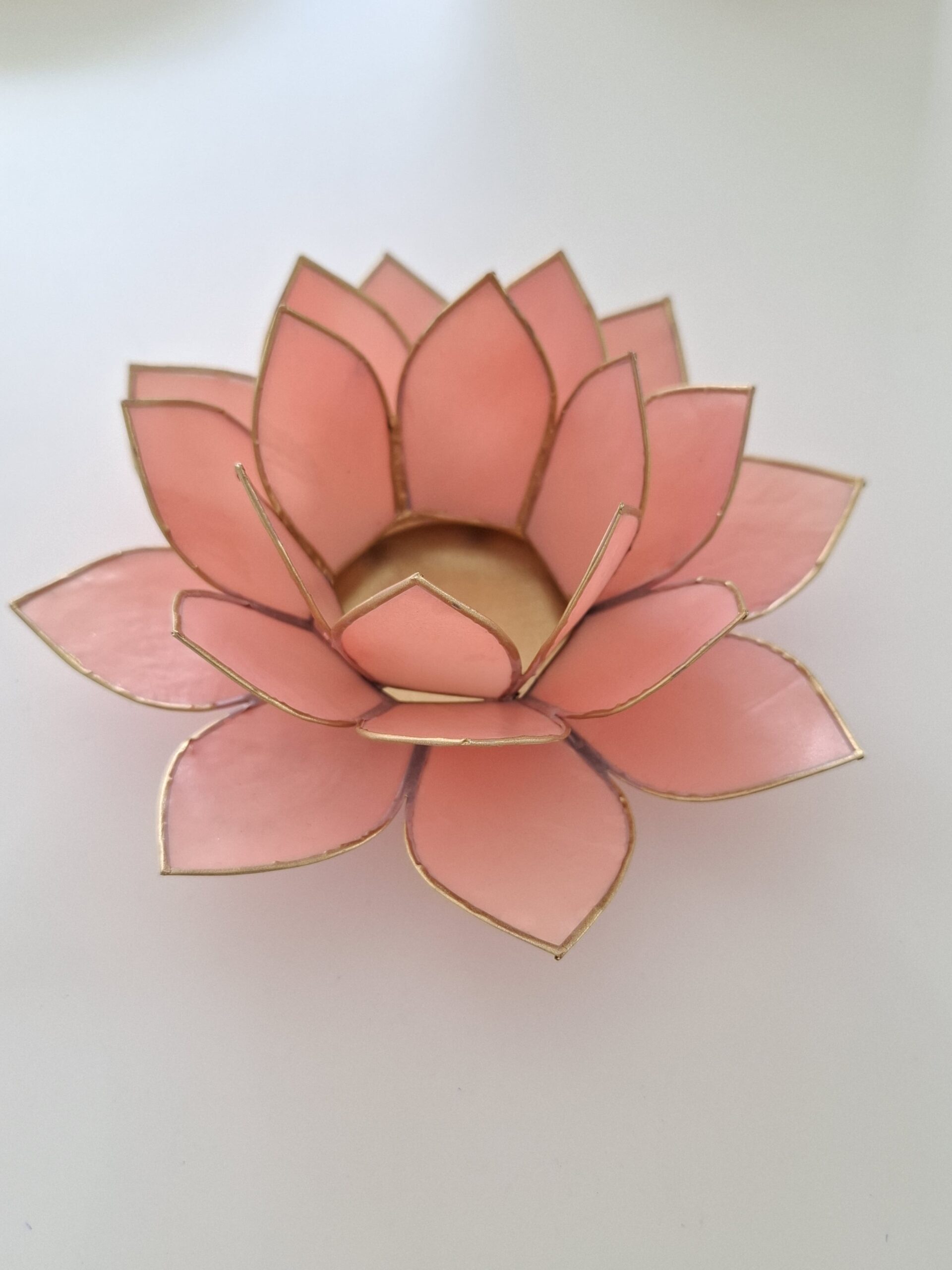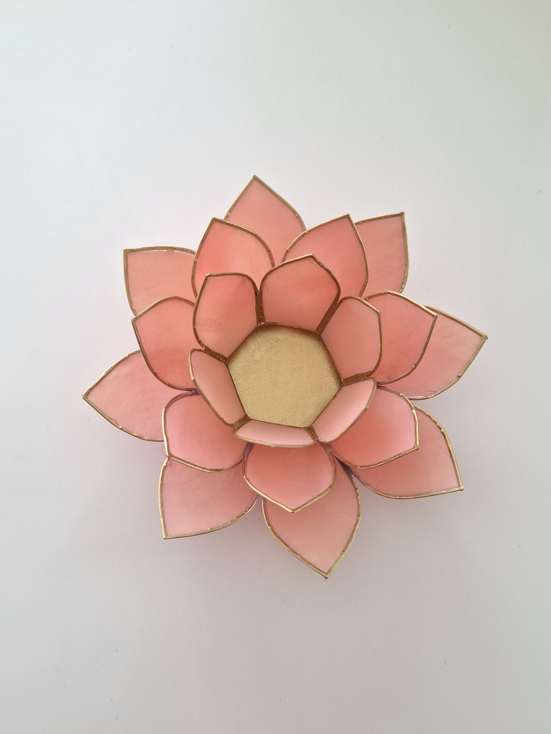 Découvrez notre bougeoir éclairage Lotus Rose et or, en pétales de coquilles de capiz (mollusques marin). Le Lotus symbolise le passage des ténèbres à la lumière, de l’ignorance à la connaissance. Le Lotus symbolise aussi les sept centres d’énergie dans le corps humain, les chakras. (Attention : les coquilles de capiz sont un produit naturel et peuvent présenter des imperfections mineures). Un accessoire magnifique pour créer une ambiance multicolore pour ouvrir vos Chakras. (Diamètre : 13,5cm)