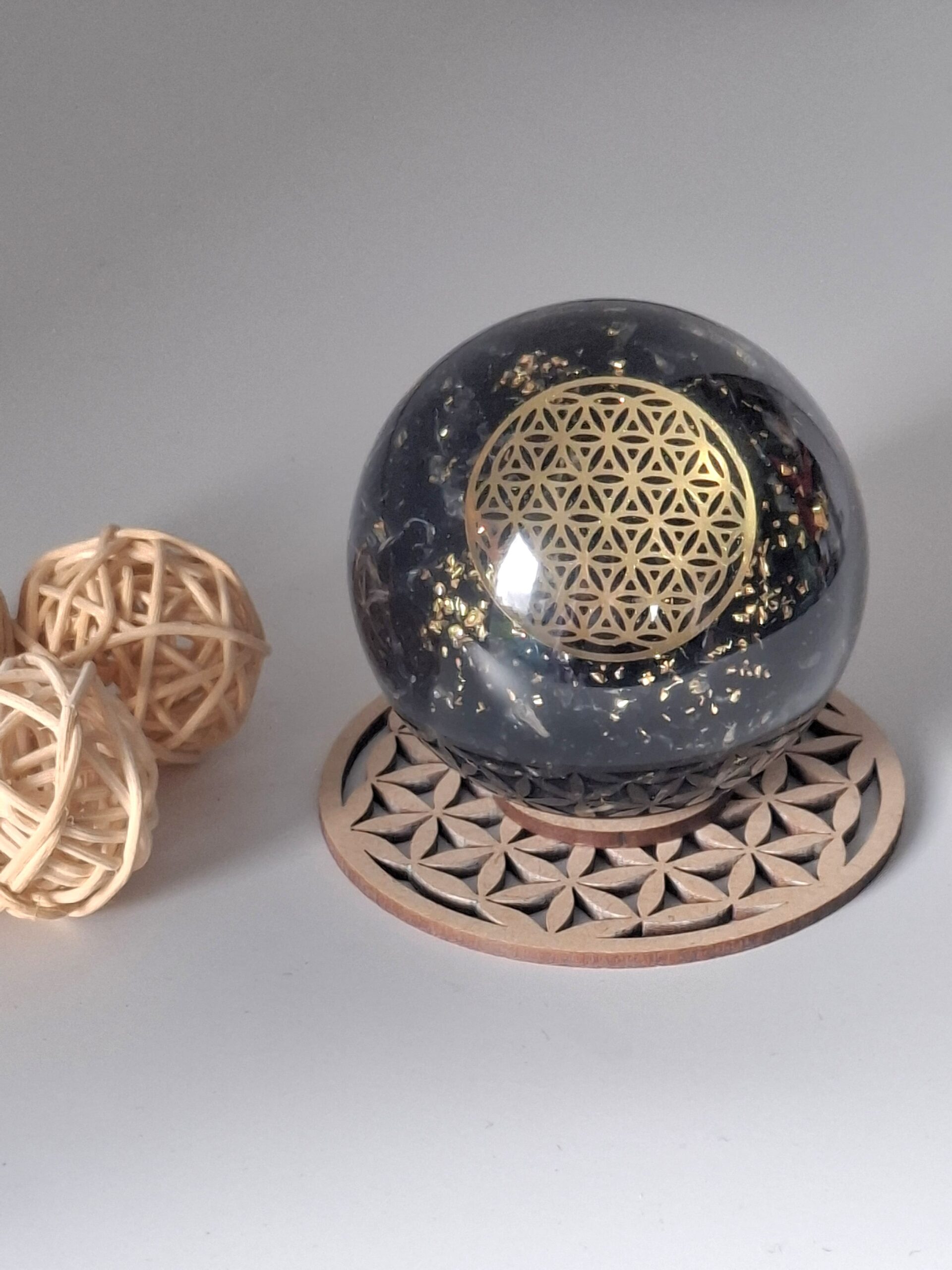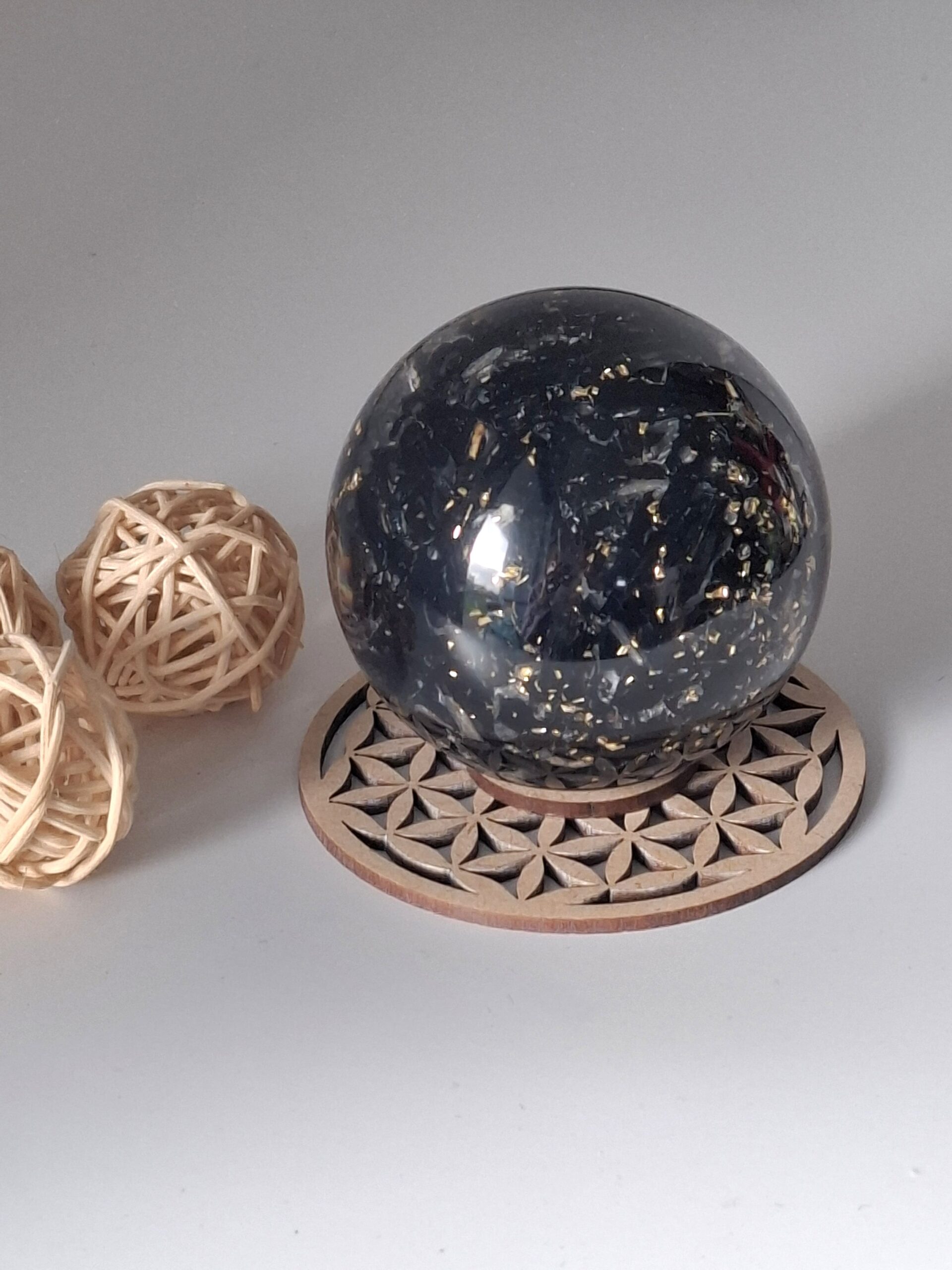 Porte-sphères en orgonite. Convient pour contenir à la fois des sphères en orgonite et en pierres précieuses.